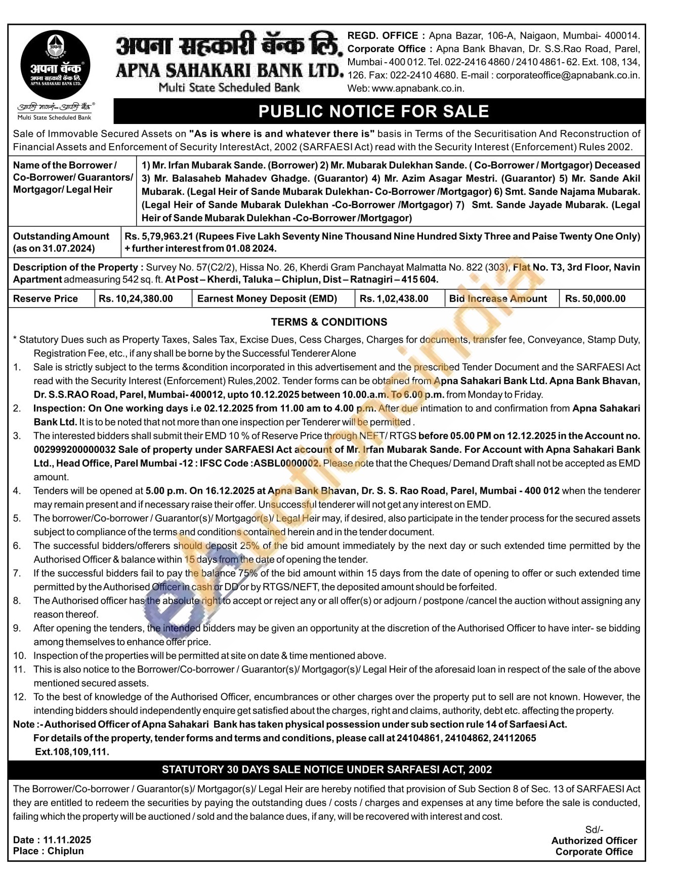 Description of the Property: Survey No. 57(C2/2), Hissa No. 26, Kherdi Gram Panchayat Malmatta No. 822 (303), Flat No. T3, 3rd Floor, Navin Apartment admeasuring 542 sq. ft. At Post-Kherdi, Taluka-Chiplun, Dist-Ratnagiri-415604.