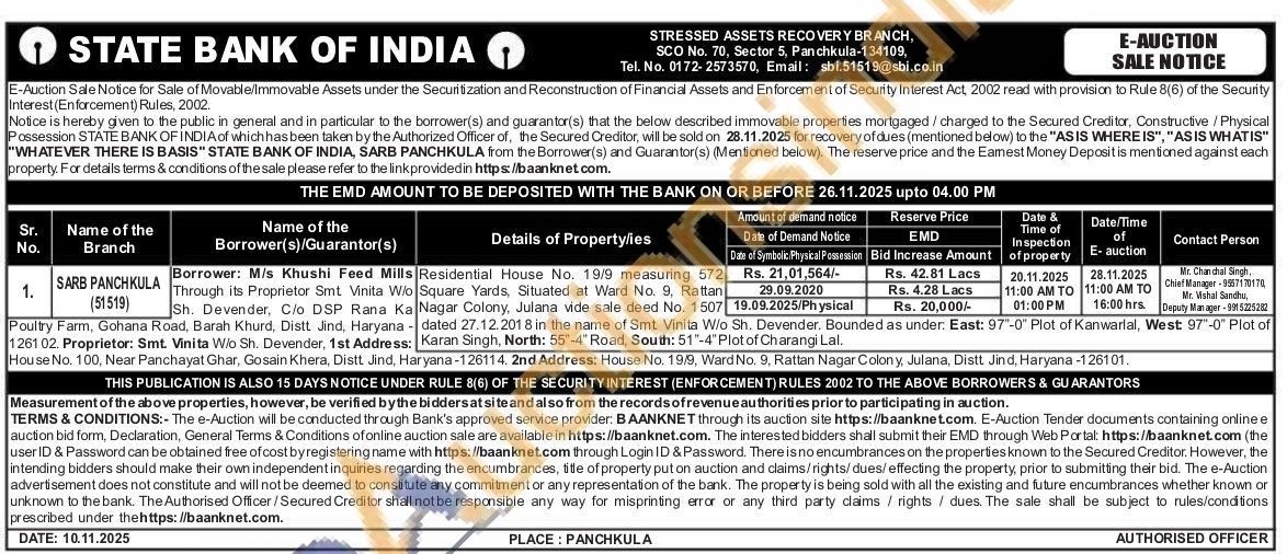 Residential House No. 19/9 measuring 572 Vinita W/o Square Yards, Situated at Ward No. 9, Rattan Rana Ka Nagar Colony, Julana vide sale deed No. 1507 Haryana dated 27.12.2018 in the name of Smt. Vinita W/o Sh. Devender. Bounded as under. East: 97-0" Plot of Kanwarlal, West 97-0 Plot of Address: Karan Singh, North: 55"-4" Road, South: 51"-4" Plot of Charangi Lal.