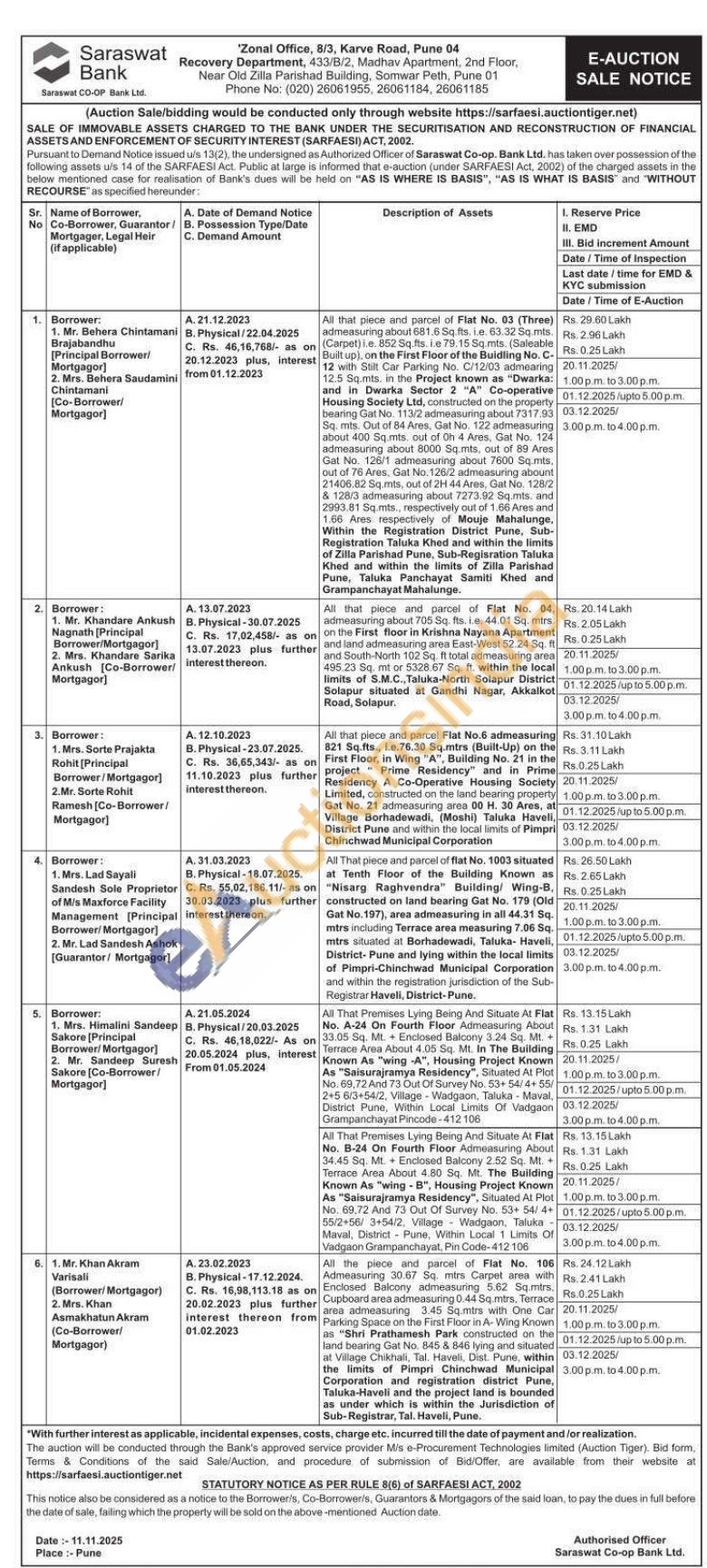 All that piece and parcel of Fiat No. 04, admeasuring about 705 Sq fts ie. 44.01 Sq. mtrs. strs on the First floor in Krishna Krishna Nayana Apartment and land admeasuring area East-West 52.24 Sq. ft and South-North 102 Sq. ft total admeasuring area 495.23 Sq. mt or 5328.67 Sq. ft. within the local limits of S.M.C., Taluka-North Solapur District Solapur situated at Gandhi Nagar, Akkalkot Road, Solapur,
