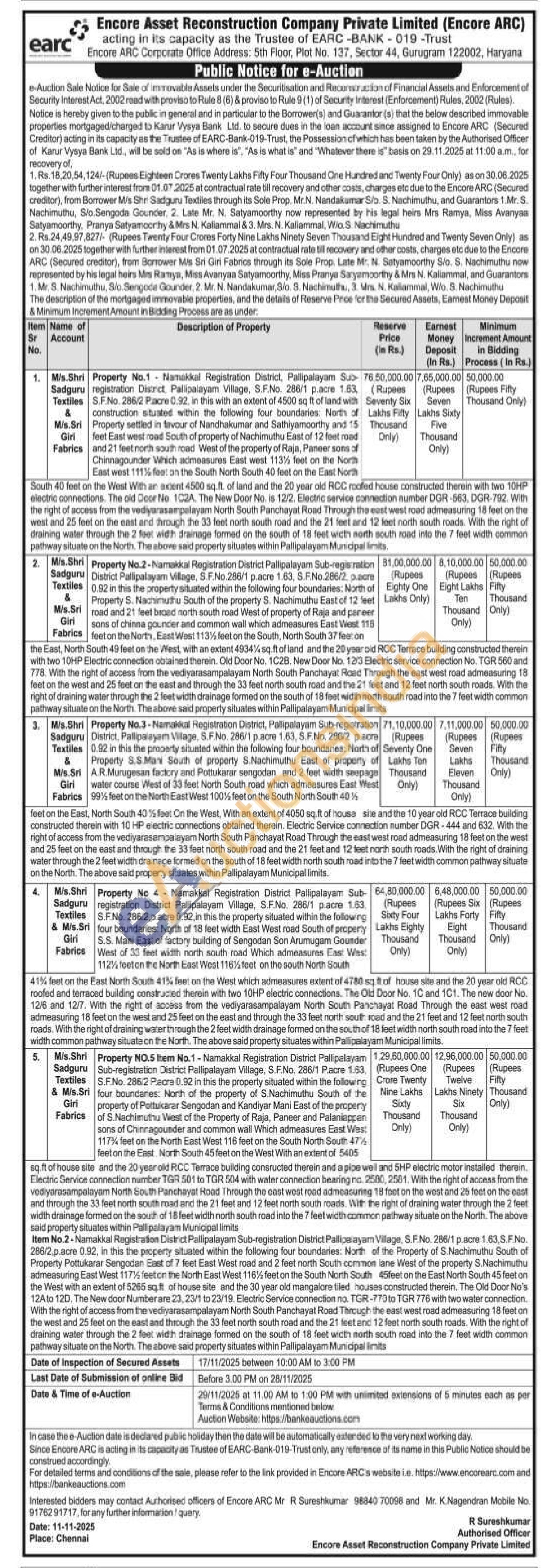 contact Authorised officers of Encore ARC Mr R Sureshkumar 98840 70098 and Mr. K.Nagendran Mobile No. 9176291717