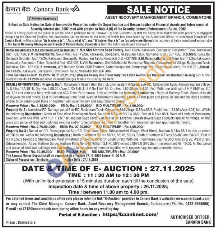 Kallakurichi Registration District, Chinnasalem @Salem Sub-RD, Kallakurichi Taluk, Ammaiyagaram Village, 1. S.F.No.11A/1818, Dry Hec 0.05.00 (Acre 0.12) Full: 2. S.F.No.11A/1B2, Dry Hec 1.62.00 (Acre 4.00) Full. With one Well with 5 HP EMP set SC No. 601 and with one Bore well and one ACC Sheet Farm house. Both are within the following Boundaries: North of Railway Track, South of lands of Jayaveeran and others, East of Samathuvapuram Road, West of Marimuthu Gounder's land. All that piece and parcel of land and buildings existing and/or to be constructed there on together with easementary and appurtenants thereto