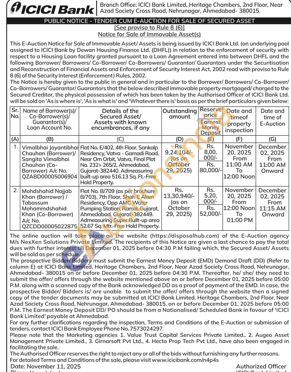 Flat No. E/402, 4th Floor, Sankalp Residency, Vatva - Gamadi Road, Near Om Orbit, Vatva, Final Plot No. 232+ 265/2, Ahmedabad, Gujarat-382440. Admeasuring built-up area 516.13 Sq. Ft.-Free Hold Property.