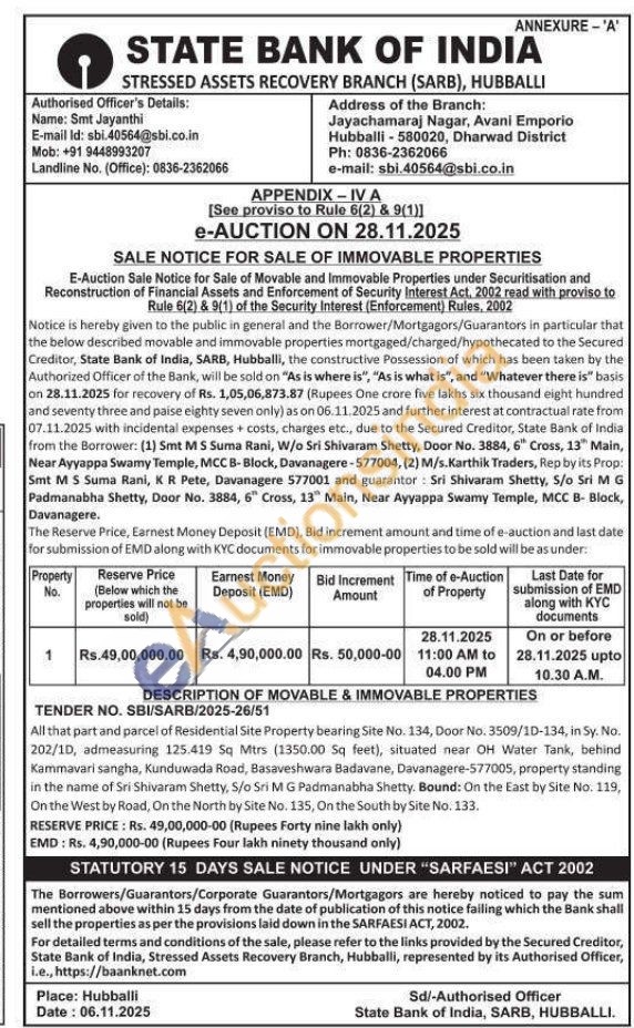 All that part and parcel of Residential Site Property bearing Site No. 134, Door No. 3509/10-134, in Sy. No. 202/1D, admeasuring 125.419 Sq Mtrs (1350.00 Sq feet), situated near OH Water Tank, behind Kammavari sangha, Kunduwada Road, Basaveshwara Badavane, Davanagere-577005, property standing in the name of Sri Shivaram Shetty, S/o Sri M G Padmanabha Shetty. Bound: On the East by Site No. 119, On the West by Road, On the North by Site No. 135, On the South by Site No.133