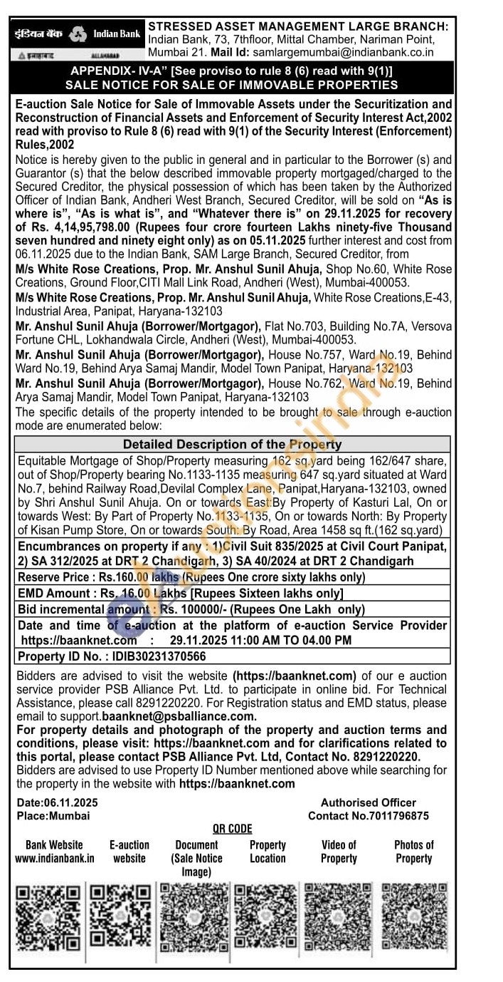 Equitable Mortgage of Shop/Property measuring 162 sq.yard being 162/647 share, out of Shop/Property bearing No. 1133-1135 measuring 647 sq.yard situated at Ward No.7, behind Railway Road, Devilal Complex Lane, Panipat, Haryana-132103, owned by Shri Anshul Sunil Ahuja. On or towards East:By Property of Kasturi Lal, On or towards West: By Part of Property No.1133-1135, On or towards North: By Property of Kisan Pump Store, On or towards South: By Road, Area 1458 sq ft. (162 sq.yard