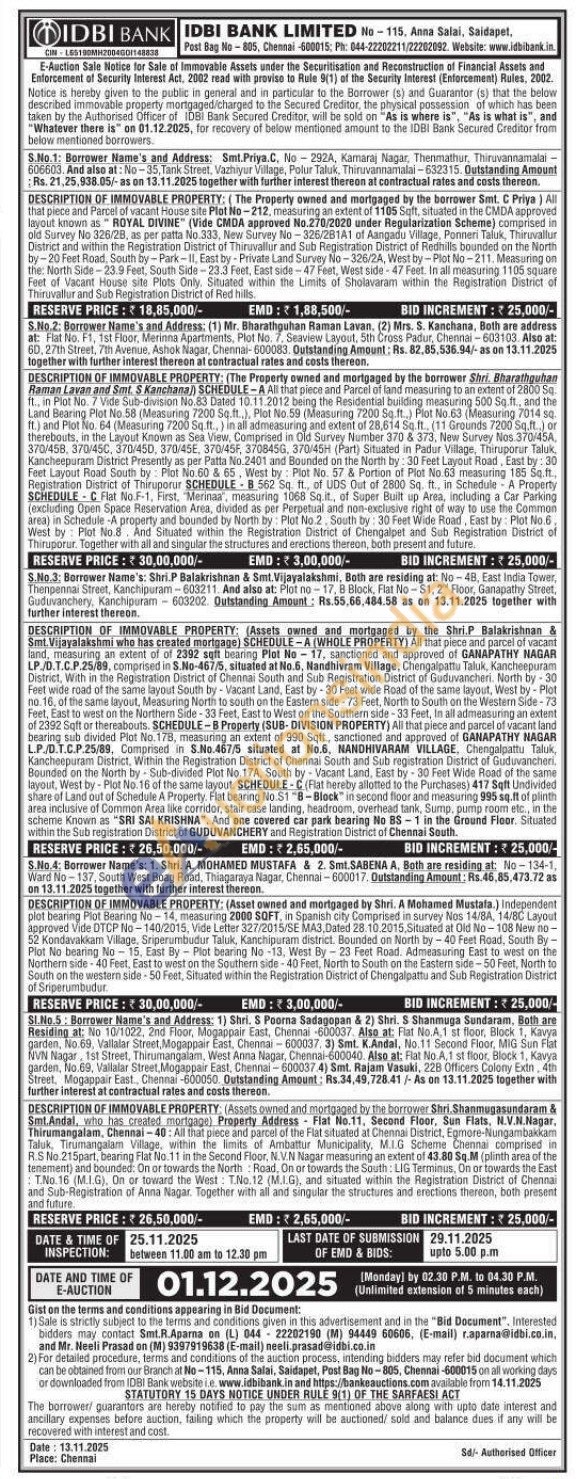 5) All that piece and parcel of the Flat situated at Chennai District, Egmore-Nungambakkam Taluk, Tirumangalam Village, within the limits of Ambattur Municipality, M.I.G Scheme Chennai comprised in R.S No. 215part, bearing Flat No.11 in the Second Floor, N.V.N Nagar measuring an extent of 43.80 Sq.M (plinth area of the tenement) and bounded: On or towards the North Road. On or towards the South: LIG Terminus, On or towards the East T.No. 16 (M.I.G), On or toward the West: T.No.12 (M.I.G), and situated within the Registration District of Chennai and Sub-Registration of Anna Nagar. Together with all and singular the structures and erections thereon, both present and future.