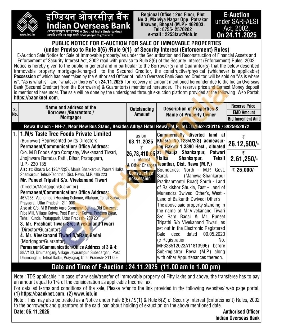 Commercially diverted land at Khasra No.128/4/2(S) admeasur-ing Rakwa 1.3390 Hect., situated at Mauja Shankarpur, Patwari Halka Shankarpur, Tehsil Teonthar, Dist. Rewa (M.Ρ