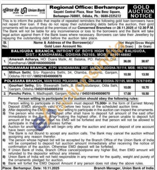 Union Bank of India Gold Auctions Auction in Ganjam