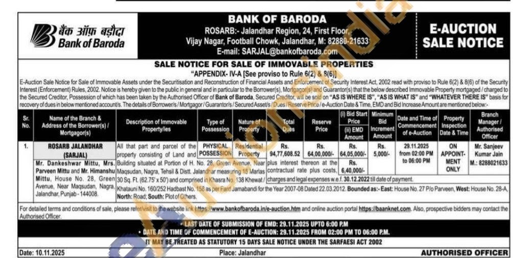 All that part and parcel of the property consisting of Land and Building situated at Portion of H. No. 28, Green Avenue, Near Maqsudan, Nagra, Tehsil & Distt. Jalandhar measuring 15 Marias 30 Sq. Ft. (62.75 x 50) and comprised in Khasra No. 138 Khewat/ Khatauni No. 160/252 Hadbast No. 158 as per Fard Jamabandi for the Year 2007-08 Dated 22.03.2012. Bounded as:-East: House No. 27 Pio Parveen, West: House No. 28-A North: Road, South: Plot of Others.