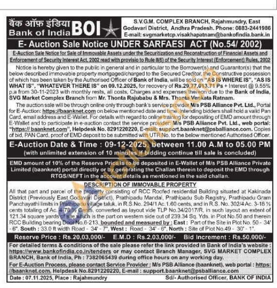 All that part and parcel of the property consisting of RCC Roofed residential Building situated at Kakinada District (Previously East Godavari District), Prathipadu Mandal, Prathipadu Sub Registry, Prathipadu Gram Panchayathi limits in Prathipadu village taluk, in R.S.No. 294/1 Ac. 1.60 cents, and in R.S. No. 302/4 Ac. 3-18% cents totaling of Ac 4-78% Cents, converted as layout vide TLP No.34/2017/R, in such layout an extent of 121.34 square yards of site which is the part on western side out of 239.34 Sq. Yds. in Plot No. 50 and therein RCC Building bearing Door No.6-213
