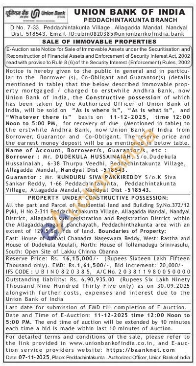 All the part and Parcel of Residential land and Building Sy.No.372/12 Pyki, H No 2-311 Peddachinthakunta Village, Allagadda Mandal, Nandyal District, Allagadda sub registration and Registration District within the Allagadda Nagara panchayath, Peddachinthakunta area with an extent of 129.5 Sq. Yds of land.