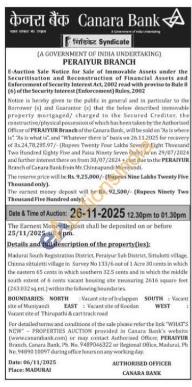 Madurai South Registration District, Peraiyur Sub District, Sittulotti village, Chinna sittulotti village in Survey No 133/6 out of 1 Acre 30 cents in which the eastern 65 cents in which southern 32.5 cents and in which the middle south extent of 6 cents vacant housing site measuring 2616 square feet [243.032 sq.mt
