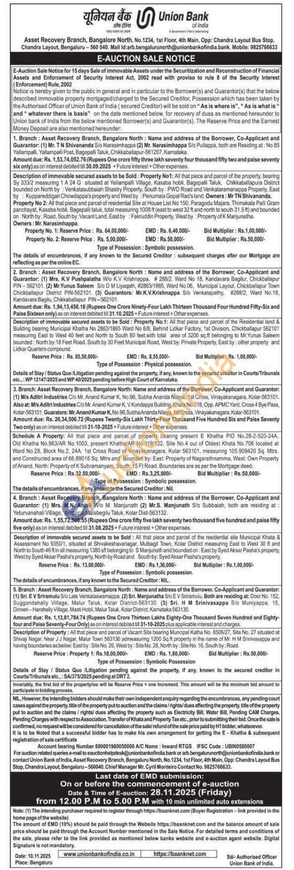 1)Property No1: All that piece and parcel of the property, bearing Sy 333/2 measuring 1 A 24 G situated at Yellampalli Village, Kasaba hobli, Bagepalli Taluk, Chikkaballapura District bounded on North by Venkatasubbalah Shastry Property, South by: PWD Road and Venkataramanappa Property, East by Kuppareddigari Chowdappa's property and West by Penumaia Gopal Rao's fand. Owners: Mr TN Shivananda