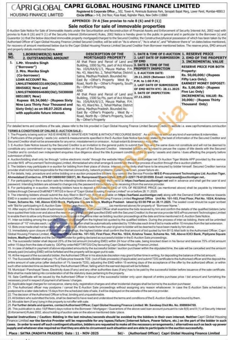 All that Plece and Parcel of Land and Building, 1000 Sq Fts, part of Arzi Khasra No. 10/6/KA/6/1/3, Mauza Maihar, P.H. No. 43, Ward No. 2. Tehsil Malhar, District Satna, Madhya Pradesh, Bounded As: Road, North By-Other's Property, South East By -Other's Property West By-By-Other's Property& All that Piece and Parcel of Land and Building, 1500 Sq Fts, part of Arzi Khasra No. No. 10/6/KA/6/1/2, Mauza Maihar, PH. No. 43, Ward No. 2. Tehsil Maihat, District Satna, Madhya Pradesh. Bounded As: East By -Other's Property, West By-Road, North By-Other's Property, South By-Other's Property