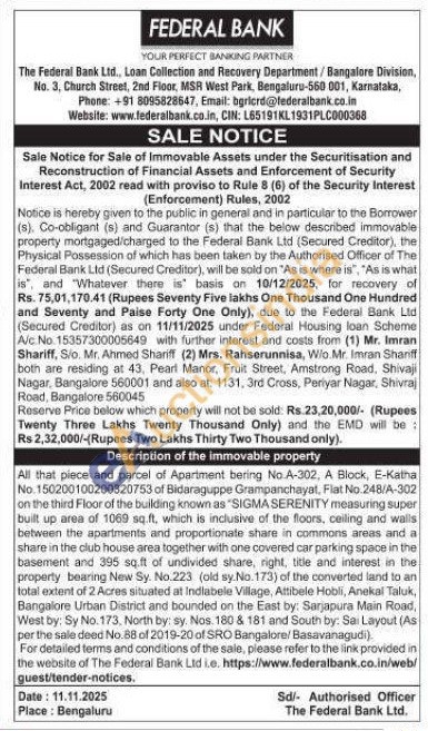 All that piece and parcel of Apartment bering No.A-302, A Block, E-Katha No.150200100200320753 of Bidaraguppe Grampanchayat, Flat No.248/A-302 on the third Floor of the building known as "SIGMA SERENITY measuring super built up area of 1069 sq.ft, which is inclusive of the floors, ceiling and walls between the apartments and proportionate share in commons areas and a share in the club house area together with one covered car parking space in the basement and 395 sq.ft of undivided share, right, title and interest in the property bearing New Sy. No.223 (old sy.No. 173) of the converted land to an total extent of 2 Acres situated at Indlabele Village, Attibele Hobli, Anekal Taluk, Bangalore Urban District and bounded on the East by: Sarjapura Main Road, West by: Sy No. 173, North by: sy. Nos. 180 & 181 and South by: Sar Layout (As per the sale deed No.88 of 2019-20 of SRO Bangalore/ Basavanagudi).