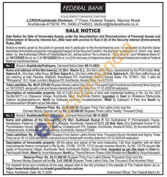 2) All the piece and parcel of the land measuring 1.62 Ares together with all other improvements thereon comprised in Re-Sy No. 131/86, 131/76, 131/2 (as per revenue records), Sy No. 131/76 (as per title deed) of Perumanna Village, Kozhikode Taluk, Kozhikode District, Kerala State, bounded as per title deed on East by: Panchayath Nirath, West by: Anya Kaivasam, North by: Thannil Nininum Theeru Vitta Sthalam and South by: Anya Kaivasam
