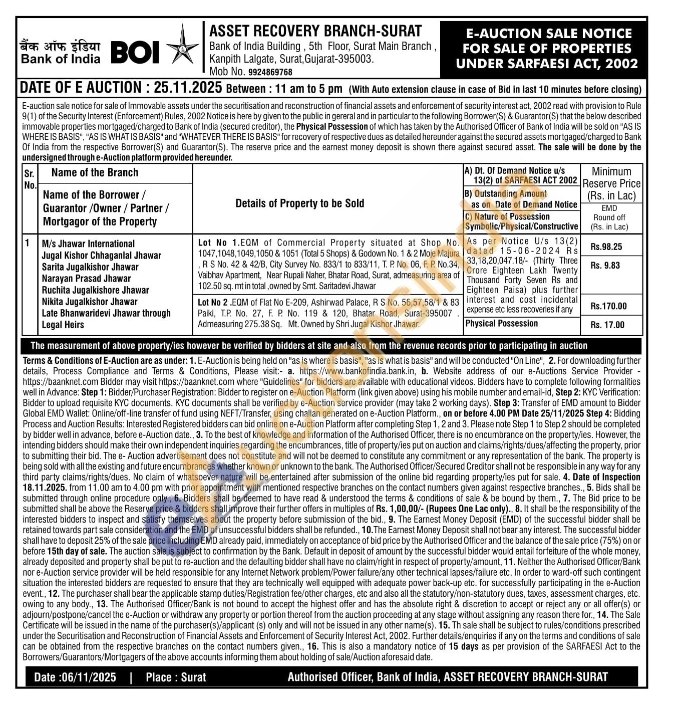 EQM of Flat No E-209, Ashirwad Palace, R S No. 56,57,58/1 & 83 Paiki, T.P. No. 27, F. P. No. 119 & 120, Bhatar Road, Surat-395007 Admeasuring 275.38 Sq. Mt. Owned by Shri Jugal Kishor Jhawar