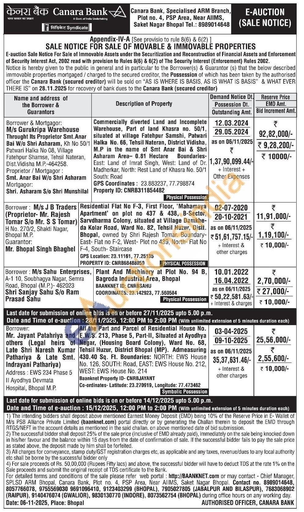 Commercially diverted Land and Incomplete Warehouse, Part of land Khasra no. 50/1, situated at village Fatehpur Samshi, Patwari Halka No. 66, Tehsil Nateran, District Vidisha, M.P in the name of Smt Anar Bai & Shri Asharam Area- 0.81 Hectare Boundaries-East: Land of Imrat Singh, West: Land of Dr. Madherkar, North: Rest Land of Khasra No. 50/1 South: Road