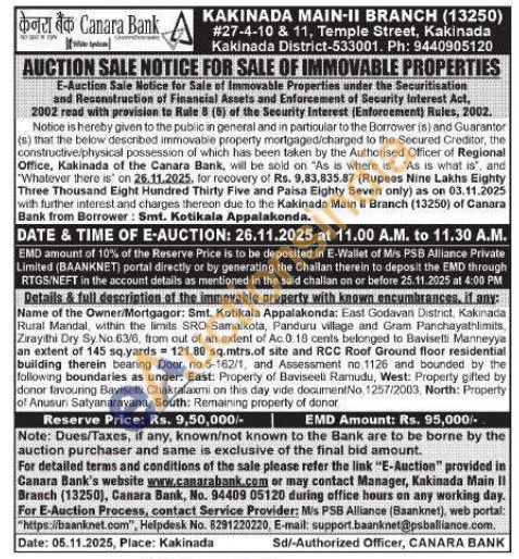 East Godavan District, Kakinada Rural Mandal, within the limits SRO-Samalkota, Panduru village and Gram Panchayathlimits, Zirayithi Dry Sy No 63/6, from out of an extent of Ac. 0.18 cents belonged to Bavisetti Manneyya an extent of 145 sq.yards 121.80 sq.mtrs.of site and RCC Roof Ground floor residential building therein bearing Door no.5-162/1, and Assessment no 1126 and bounded by the following boundaries as under: East: Property of Baviseeli Ramudu, West: Property gifted by donor favouring Bavisefti Chakralaxmi on this day vide documentNo, 1257/2003, North: Property of Anusur Satyanarayana, South: Remaining property of donar