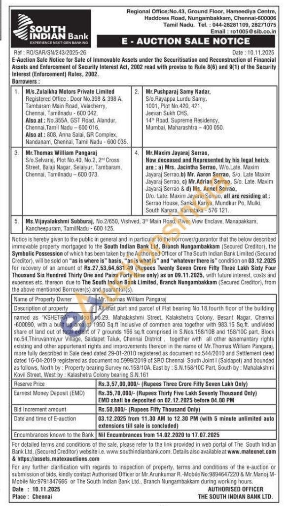 All that part and parcel of Flat bearing No. 18, fourth floor of the building named as "KSHETRA" in door no.29. Mahalakshmi Street, Kalakshetra Colony, Besant Nagar, Chennai -600090, with a built up area of 1950 Sq.ft inclusive of common area together with 983.15 Sq.ft. undivided share of land out of total extent of 7 grounds 166 sq.ft comprised in S.Nos. 158/108 and 158/10C part, Block no.54, Thiruvanmiyur Village, Saidapet Taluk, Chennai District, together with all other easemantary rights existing and other appurtenant rights and improvements thereon in the name of Mr. Thomas William Pangaraj more fully described in Sale deed dated 29-01-2010 registered as document no.544/2010 and Settlement deed dated 16-04-2019 registered as document no. 5999/2019 of SRO Chennai South Joint I (Saidapet) and bounded as follows, North by: Property bearing Survey no.158/10A, East by: S.N.158/10C Part, South by: Mahalakshmi Kovil Street, West by: Kalashetra Colony bearing S.N.161