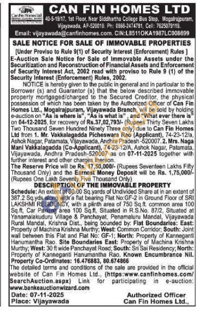 Schedule: An extent of 30.00 Sq.yards of Undivided Share at in an extent of 387.2 Sq.yds along with a flat bearing Flat No:GF-2 in Ground Floor of SRI LAKSHMI RESIDENCY, with a plinth area of 750 Sq.ft. common area 100 Sq.ft, Car Parking area 100 Sq.ft. Situated in R.S.No. 87/2, Situated at Yanamalakuduru Village & Panchayat, Penamaluru Mandal, Vijayawada Rural Mandal, Krishna Dist., being bounded by: Flat Boundaries: East: Property of Machina Krishna Murthy; West: Common Corridor, South: Joint wall between this Flat and Flat No: GF-1; North: Property of Kanneganti Hanumantha Rao. Site Boundaries East: Property of Machina Krishna Murthy; West: 30 ft wide Panchayat Road, South: Sri Sai Residency; North: Property of Kanneganti Hanumantha Rao. Known Encumbrance Nil.