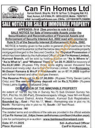 An extent of 102.22 Sq.Yds in Survey No.75 Sub Division Survey No. 75/1, Plot No. 16 (SE-Part), Dinnedevarapadu Village, Near NH-44 Road, Kurnool, Kurnool District, Andra Pradesh, Kurnool Sub Registration. Bounded by: East: Plot No.17, West: Remaining site in plot no. 16. North: Remaining site in plot no. 16, South: 30" feet Road