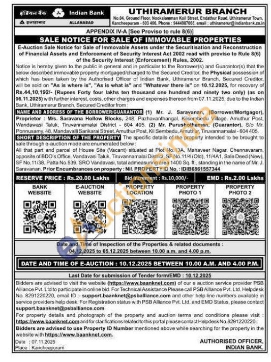 All that part and parcel of House Site (Vacant) situated at Plot No 13A, Mahaveer Nagar, Chennavaram, opposite of BDO's Office, Vandavasi Taluk, Tiruvannamalai District, SF No. 11/4 (Old), 11/4A1, Sale Deed (New). SF No. 11/38, Patta No 539, SRO Vandavasi, total admeasuring area 1400 Sq. ft., standing in the name of Mr. J Saravanan. Prior Encumbrances on property: Nil. PROPERTY ID No.: IDIB6861557344