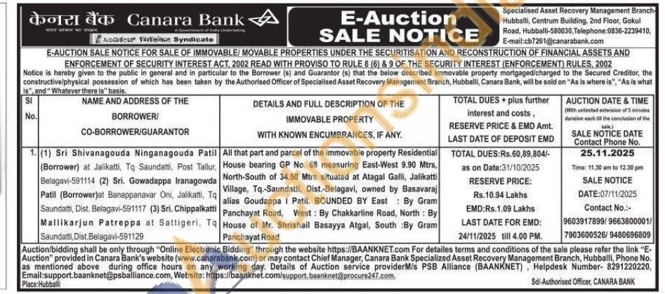 All that part and parcel of the immovable property Residential House bearing GP No. 68 measuring East-West 9.90 Mtrs. North-South of 34.50 Mtrs situated at Atagal Galli, Jalikatti Village, Tq.-Saundatti, Dist.-Belagavi, owned by Basavaraj alias Goudappa | Patil, BOUNDED BY East: By Gram Panchayat Road, West: By Chakkarline Road, North: By House of Mr. Shrishail Basayya Atgal, South By Gram Panchayat Road