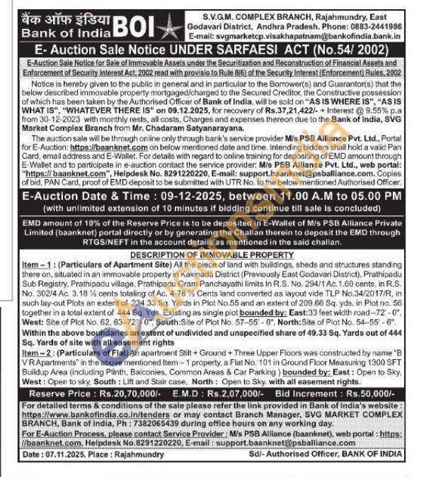Item-1: (Particulars of Apartment Site) All the piece of land with buildings, sheds and structures standing there on, situated in an immovable property in Kakinada District (Previously East Godavari District), Prathipadu Sub Registry, Prathipadu village, Prathipadu Gram Panchayathi limits In R.S. No. 294/1 Ac. 1.60 cents, in R.S. No. 302/4 Ac. 3,18% cents totaling of Ac. 4-78% Cents land converted as layout vide TLP No.34/2017/R, in such lay-out Plots an extent of 234.33 Sq. Yards in Plot No.55 and an extent of 209.66 Sq. yds. in Plat no. 56 together in a total extent of 444 Sq. Yds. Existing as single plot bounded by: East:33 feet width road-72-0". West: Site of Plot No. 62, 63-72-0", South: Site of Plot No. 57-55-6", North: Site of Plot No. 54-55-6". Within the above boundaries an extent of undivided and unspecified share of 49.33 Sq. Yards out of 444 Sq. Yards of site with all easement rights Item-2: (Particulars of Flat) An apartment Stilt + Ground + Three Upper Floors was constructed by name "B VRApartments" in the above mentioned Item-1 property, a Flat No. 101 in Ground Floor Measuring 1300 SFT Buildup Area (including Plinth, Balconies, Common Areas & Car Parking) bounded by: East: Open to Sky, West: Open to sky, South: Lift and Stair case, North: Open to Sky, with all easement rights