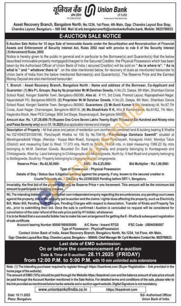 All that piece and parcel of residential cum commercial converted land & building bearing E Khatha No. 152100407201000185, Panchayath Khatha no 150 Sy No.704/16, "Panchalinga Darshana Sawmill" situated at Maralinganadoddi Village, (Mandya Koppa Main Road), Karagodu Gram Panchayath, Karagodu Hobli, Mandya Taluk (District) and measuring East to West: 17.373 mts, North to South: 78.638 mts, in total measuring 1366.23 Sq mtrs belonging to Mr.M. Darshan Gowda. Bounded On: East by: Highway and property belonging to Kundegowda and Chikkegowda, West by: Land belonging to Chikkegowda and Muddegowda, North by: 5 feet Road and property belonging to Siddegowda, South by: Property belonging to Lingegowda alias Jongegowda