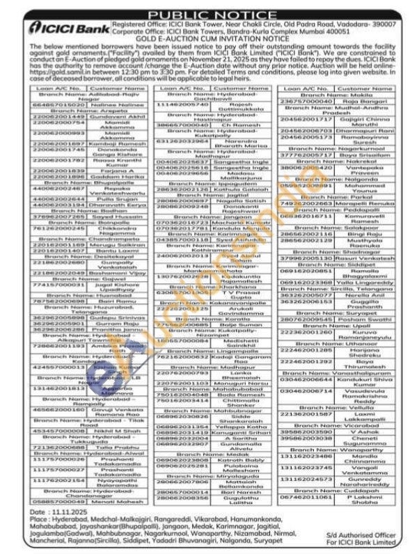 ICICI Bank Gold Auctions Auction in Hyderabad