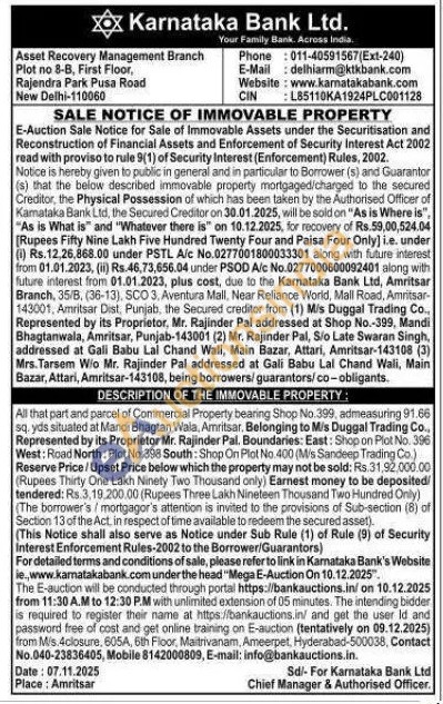 All that part and parcel of Commercial Property bearing Shop No. 399, admeasuring 91.66 sq. yds situated at Mandi Bhagtan Wala, Amritsar, Belonging to Mis Duggal Trading Co., Represented by its Proprietor Mr. Rajinder Pal.