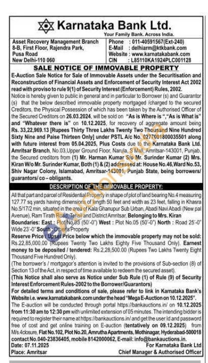 All that part and parcel of Residential Property in shape of plot of land bearing No.4 measuring 127.77 sq yards having dimensions of length 50 feet and width as 23 feet, falling in Khasra No.5/17/2 min, situated in the area of Kala Ghanupur Sub Urban, Abadi Navi Abadi (New pal Avenue), Ram Tirath Road, Tehsil and District Amritsar, Belonging to Mrs. Kiran Boundaries: East: Plot No.03 (50-0) West: Plot No.05 (50-0') North: Road 25-0 Wide 23-0 South: Other's Property