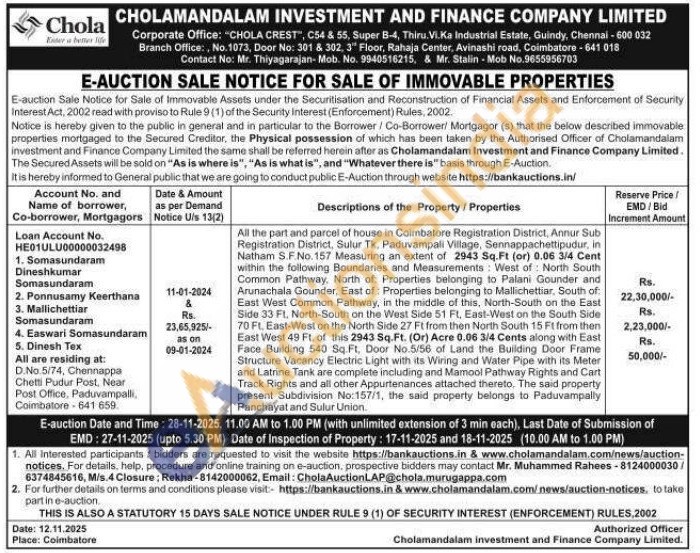All the part and parcel of house in Coimbatore Registration District, Annur Sub Registration District, Sulur Tk, Paduvampali Village, Sennappachettipudur, in Natham S.F.No. 157 Measuring an extent of 2943 Sq.Ft (or) 0.06 3/4 Cent within the following Boundaries and Measurements: West of North South Common Pathway, North of Properties belonging to Palani Gounder and Arunachala Gounder, East of: Properties belonging to Mallichettiar, South of: East West Common Pathway, in the middle of this, North-South on the East Side 33 Ft. North-South on the West Side 51 Ft, East-West on the South Side 70 Ft. East-West on the North Side 27 Ft from then North South 15 Ft from then East West 49 Ft, of this 2943 Sq.Ft. (Or) Acre 0.06 3/4 Cents along with East Face Building 540 Sq. Ft, Door No.5/56 of Land the Building Door Frame Structure Vacancy Electric Light with its Wiring and Water Pipe with its Meter and Latrine Tank are complete including and Mamool Pathway Rights and Cart Track Rights and all other Appurtenances attached thereto. The said property present Subdivision No:157/1, the said property belongs to Paduvampally Panchayat and Sulur Union.
