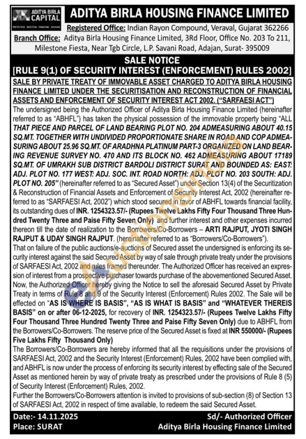 ALL THAT PIECE AND PARCEL OF LAND BEARING PLOT NO. 204 ADMEASURING ABOUT 40.15 SQ.MT. TOGETHER WITH UNDIVIDED PROPORTIONATE SHARE IN ROAD AND COP ADMEA-SURING ABOUT 25.96 SQ.MT. OF ARADHNA PLATINUM PART-3 ORGANIZED ON LAND BEAR-ING REVENUE SURVEY NO. 470 AND ITS BLOCK NO. 462 ADMEASURING ABOUT 17189 SQ.MT. OF UMRAKH SUB DISTRICT BARDOLI DISTRICT SURAT AND BOUNDED AS: EAST: ADJ. PLOT NO. 177 WEST: ADJ. SOC. INT. ROAD NORTH: ADJ. PLOT NO. 203 SOUTH: ADJ. PLOT NO. 205