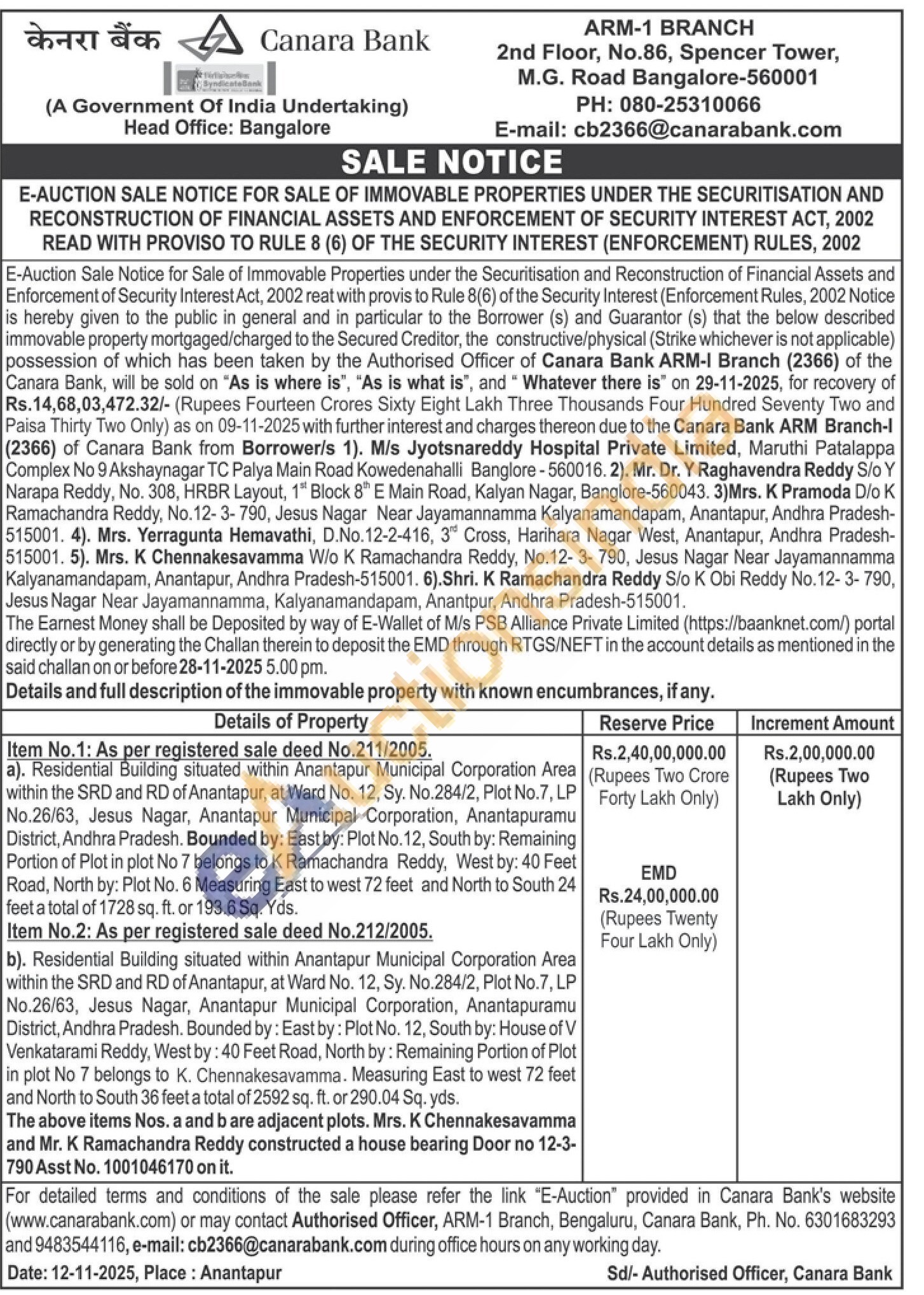 a). Residential Building situated within Anantapur Municipal Corporation Area within the SRD and RD of Anantapur, at Ward No. 12, Sy. No.284/2, Plot No.7, LP No.26/63, Jesus Nagar, Anantapur Municipal Corporation, Anantapuramu District, Andhra Pradesh. Bounded by: East by: Plot No. 12, South by: Remaining Portion of Plot in plot No 7 belongs to K Ramachandra Reddy, West by: 40 Feet Road, North by: Plot No. 6 Measuring East to west 72 feet and North to South 24 feet a total of 1728 sq. ft. or 193.6 Sq. Yds.