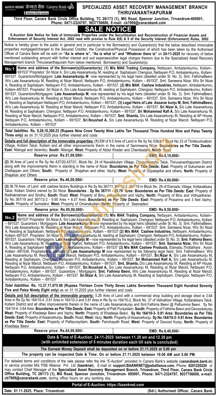 36.76 Ares of Land with cashew factory Buildings in Re Sy No 367/11,367/12-2,367/19 in Block No. 29 of Elamadu Village, Kottarakkara Taluk, Kollam District owned by Sri Nizar, Boundaries: Sy No 367/11-20.79 Ares: Boundaries as Per Title Deeds: East: Property of Radhakrishnan and Sindhu, South: Road, West: Property of Binu, vidhyadharan and Vazhy; North: Property of Binu and Vidhyadharan Sy No 367/19 and 367/12-2-9.90 Ares 6.07 Ares: Boundaries as Per Title Deeds: East: Property of Prasanna and 3 feet Vazhy; South: Property of Sumadevi: West: Property of Omanakuttan; North: Property of Seemadevi