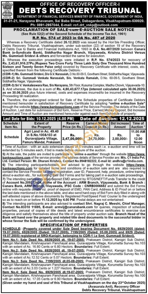 SCHEDULE: (Property covered under Sale Deed bearing Document No. 6929/2005 (dated: 19.07.2005), 6928/2005 (Dated: 19.07.2005), 7199/2005 (Dated: 05.08.2005) and 6929 (Dated: 19.07.2005) registered at SRO-Kanigiri, belonging to CDR-1 i.e Smt. Gummadi Sridevi). Item No.1: Sale Deed No. 6929/2005 dt. 19-07-2005: Prakasam District, Kanigiri Sub District, Kanigiri Mandalam, Krishnapuram Panchayat area, Guravajipeta Village, Korumetta Survey No. 103 with an extent of Ac. 16.80 Cents or 6.80 Hectors. Boundaries: Full Extent. Item No.2: Sale Deed No. 6928/2005 dt. 19-07-2005: Prakasam District, Kanigiri Sub District, Kanigiri Mandalam, Krishnapuram Panchayat area, Guravajipeta Village, Korumetta Survey No. 103 with an extent of Ac. 12.52 Cents or 5.07 Hectors. Boundaries: Full Extent. Item No.3: Sale Deed No. 7199/2005 dt.05-08-2005: Prakasam District, Kanigiri Sub District, Kanigiri Mandalam, Krishnapuram Panchayat area, Guravajipeta Village, Korumetta Survey No. 103 with an extent of Ac.3.03 Cents or 1.227 Hectors. Boundaries: Full Extent. Item No.4: Sale Deed No. 6929/2005 dt.19-07-2005: Prakasam District, Kanigiri Sub District, Kanigiri Mandalam, Krishnapuram Panchayat area, Guravajipeta Village, Korumetta Survey No. 100 with an extent of Ac. 17.05 Cents or 6.90 Hectors. Boundaries: Full Extent.