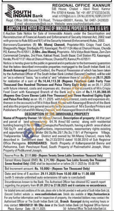 Name of Property Owner: Mr Manoj Cheruvil, Description of property: All that part and parcel of land admeasuring 64.76 Ares 160 cents) along with residential building bearing D.No:VI-508 of Cherupuzha Panchayath, having a plinth area of about 700 Sq.Ft and all other constructions, improvements, easementary rights existing and appurtenant thereon under Old Sy.No.28/1, Re.Sy.119/1 of Peringome Village, Thaliparamba Taluk, Kannur District and owned by Mr.Manoj Cheruvil, mare fully described in Settlement deed No.2133/2010 dated 10.08.2010 of Sub Registrar Office Peringome. BOUNDARIES: North Property of Kollamparambil Benny and Pathumma, East: Panchayat Road, South: Property of Podimattathil Joseph, West: Property of Podikunnel Joseph.