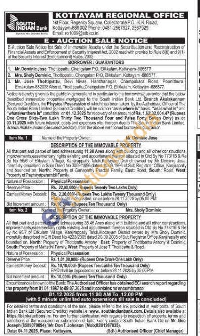 All that part and parcel of land admeasuring 38.46 Ares along with building and all other constructions, improvements, sasementary rights existing and appurtenant thereon situated in Old Sy No 773/18 & Re Sy No 98/7 of Elikulam Village, Kanjrappally Taluk, Kottayam District owned by Mrs Sholy Dominic morefully described in Gift Deed No-4223/2005 dated 20.09.2005 of Sub Registrar Office Kanjirapally and bounded on. North: Property of Thottipattu Antony East: Property of Thottipattu Antony & Dominic South: Property of Mattathil Family, West: Property of Jose T. Thottipattu & Road