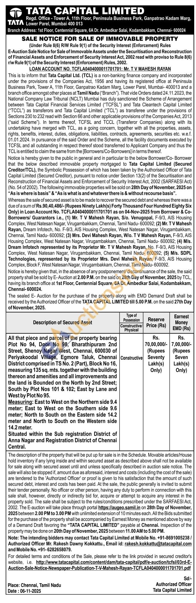 All that piece and parcel of the property bearing Plot No 94, Door No 98, Bharathipuram 2nd Street, Shenoy Nagar West, Chennai, 600030 of Periyakoodal Village, Egmore Taluk, Chennai District comprised in TS No. 2 (Part), Block No 16, measuring 135 sq. mts. together with the building. thereon and amenities and all improvements and the land is Bounded on the North by 2nd Street; South by Plot Nos 101 & 102; East by Lane and West by Plot No 95.Measuring: East to West on the Northern side 9.4. meter; East to West on the Southern side 9.6 meter; North to South on the Eastern side 14.2 meter and North to South on the Western side 14.2 meter.