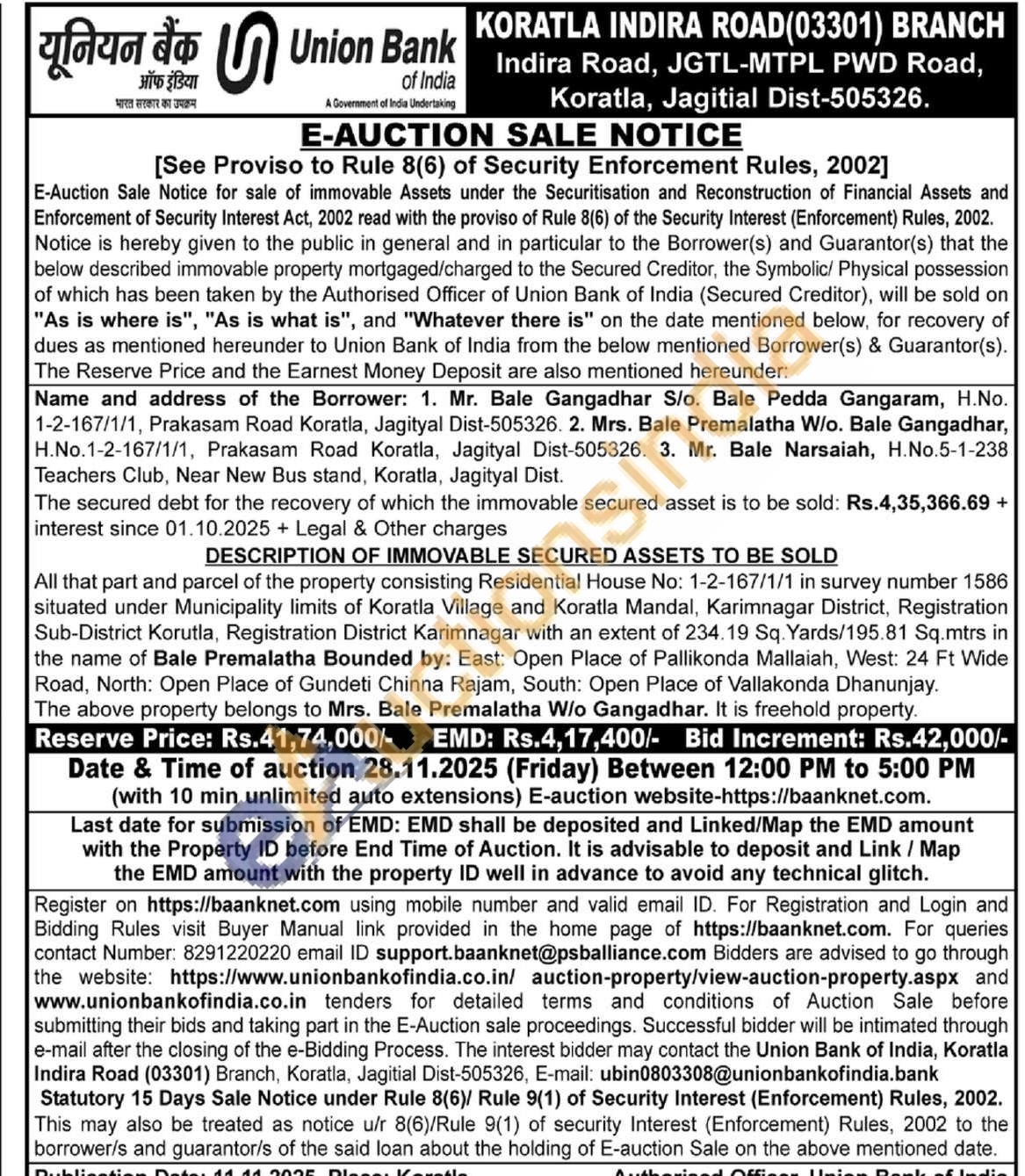 All that part and parcel of the property consisting Residential House No: 1-2-167/1/1 in survey number 1586 situated under Municipality limits of Koratla Village and Koratla Mandal, Karimnagar District, Registration Sub-District Korutla, Registration District Karimnagar with an extent of 234.19 Sq. Yards/195.81 Sq.mtrs in the name of Bale Premalatha Bounded by: East: Open Place of Pallikonda Mallaiah, West: 24 Ft Wide Road, North: Open Place of Gundeti Chinna Rajam, South: Open Place of Vallakonda Dhanunjay. The above property belongs to Mrs. Bale Premalatha W/o Gangadhar. It is freehold property