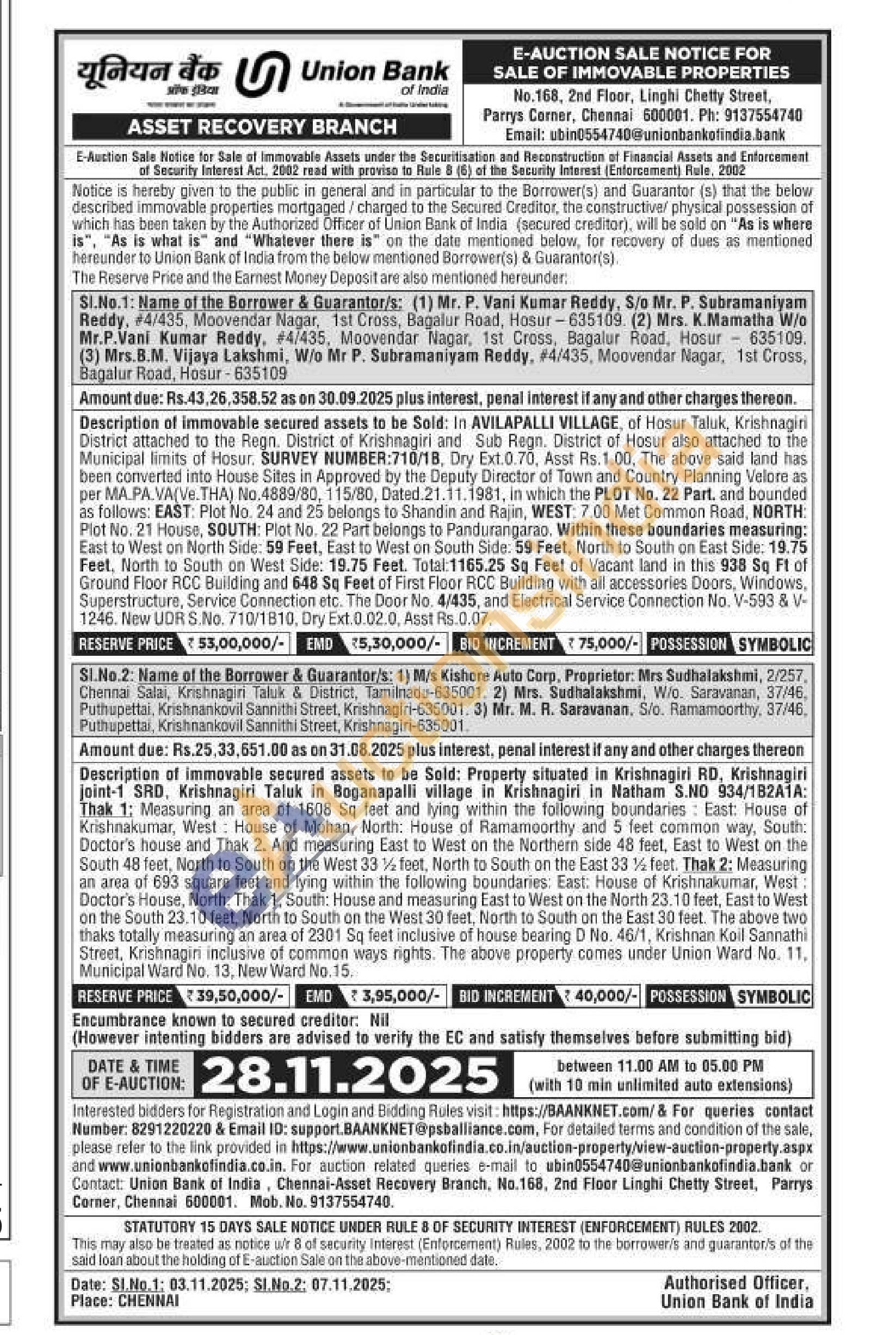 Description of immovable secured assets to be Sold: In AVILAPALLI VILLAGE, of Hosur Taluk, Krishnagiri District attached to the Regn. District of Krishnagiri and Sub Regn. District of Hosur also attached to the Municipal limits of Hosur. SURVEY NUMBER:710/18, Dry Ext.0.70, Asst Rs.1.00, The above said land has been converted into House Sites in Approved by the Deputy Director of Town and Country Planning Velore as per MA PA. VA(Ve.THA) No.4889/80, 115/80, Dated 21.11.1981, in which the PLOT No. 22 Part. and bounded as follows: EAST: Plot No. 24 and 25 belongs to Shandin and Rajin, WEST: 7.00 Met Common Road, NORTH: Plot No. 21 House, SOUTH: Plot No. 22 Part belongs to Pandurangarao. Within these boundaries measuring: East to West on North Side: 59 Feet, East to West on South Side: 59 Feet, North to South on East Side. 19.75 Feet, North to South on West Side: 19.75 Feet. Total:1165.25 Sq Feet of Vacant land in this 938 Sq Ft of Ground Floor RCC Building and 648 Sq Feet of First Floor RCC Building with all accessories Doors, Windows, Superstructure, Service Connection etc. The Door No. 4/435, and Electrical Service Connection No. V-593 & V-1246. New UDR S.No. 710/1810, Dry Ext.0.02.0. Asst Rs.0.07.
