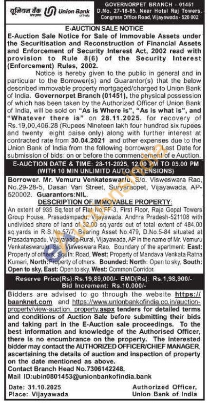 An extent of 935 Sq.feet of Flat No.FF-3, First Floor, Raja Gopal Towers Group House, Prasadampadu, Vijayawada. Andhra Pradesh-521108 with undivided share of land of 32.00 sq.yards out of total extent of 484.00 sq.yards in R.S. No.57/7, Bearing Asset No.479, D.No.5-84 situated at Prasadampadu, Vijayawada Rural, Vijayawada, AP in the name of Mr. Vemuru Venkateswarulu, Sio. Visweswara Rao. Boundary of the apartment: East: Property of others, South: Road, West: Property of Mandava Venkata Ratna Kumari, North: Property of others. Bounded: North: Open to sky, South: Open to sky. East: Open to sky, West: Common Corridor.
