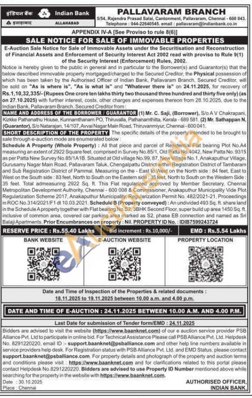 Schedule A Property (Whole Property): All that piece and parcel of Residential Flat bearing Plot No.A4 measuring an extent of 2922 Square feet, comprised in Survey No.85/1, Old Patta No.4042. New Patta No. 9315 as per Patta New Survey No. 85/1A1B. Situated at Old village No.99, 87, New Village No. 1, Anakaputhur Village, Gurusamy Nagar Main Road, Pallavaram Taluk, Chengalpattu District within Registration District of Tambaram and Sub Registration District of Pammal, Measuring on the East to West on the North side 84 feet, East to West on the South side: 83 feet, North to South on the Eastern side: 35 feet, North to South on the Western Side: 35 feet. Total admeasuring 2922 Sq. ft. This Flat regularized approved by Member Secretary, Chennal Metropolitan Development Authority, Chennai-600 008 & Commissioner, Anakaputhur Municipality Vide Plot Regularization Scheme 2017, Anakaputhur Municipality, Regularization Permit No. 482/2021-21, Proceedings in ROC No.314/2021/F1 dl 10.03.2021. Schedule B (Property conveyed): An undivided 493 Sq. ft. share land in the Schedule A property together with Flat bearing No. S2, 3BHK Second Floor, super build up area 1450 Sq. ft. inclusive of common area, covered car parking area marked as S2, phase EB connection and named as Sri Balaji Apartments. Prior Encumbrances on property: Nil. PROPERTY ID No.: IDIB7599243724