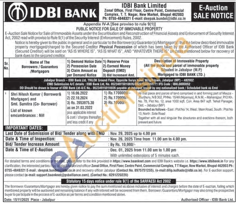All that piece and parcel of land comprised in and forming part of Mauza - Jhurjhuru, NB 302, PHNo. 15/49 (Nipaniya), R.N.M.-Maharajpur, PIO Kh No. 78, Plot No. 12, area 1000 sqft. Con. Area 647 sqft. Tehsil Panagar, Dist-Jabalpur (MP) Bounded as follows-East: Plot No 14, West: Main Road, South: Plot No 13, North: Side Road Together with all and singular the structures and erections thereon, bolh present and fulure