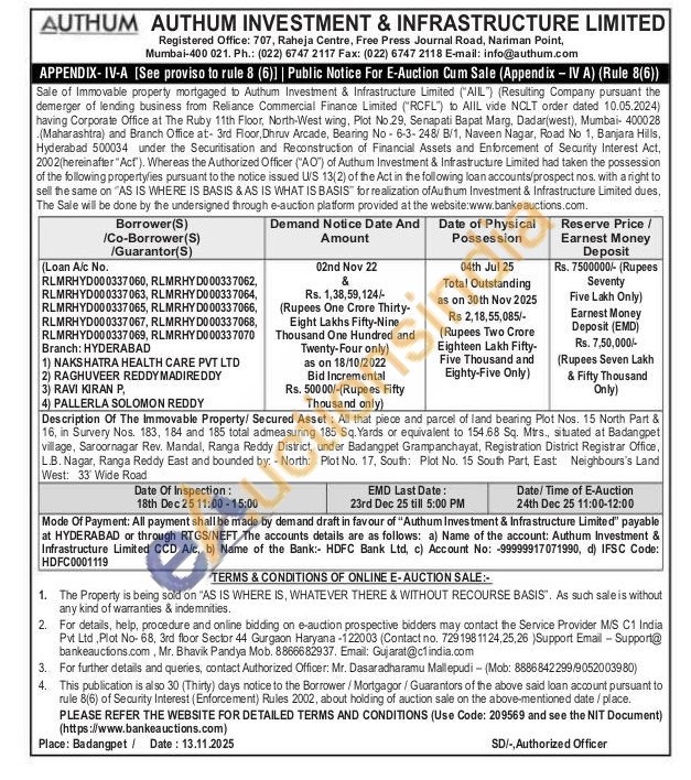 Description Of The Immovable Property/ Secured Asset: All that piece and parcel of land bearing Plot Nos. 15 North Part & 16, in Survery Nos. 183, 184 and 185 total admeasuring 185 Sq. Yards or equivalent to 154.68 Sq. Mtrs., situated at Badangpet village, Saroornagar Rev. Mandal, Ranga Reddy District, under Badangpet Grampanchayat, Registration District Registrar Office, L.B. Nagar, Ranga Reddy East and bounded by: North: Plot No. 17, South: Plot No. 15 South Part, East: Neighbours's Land West: 33 Wide Road