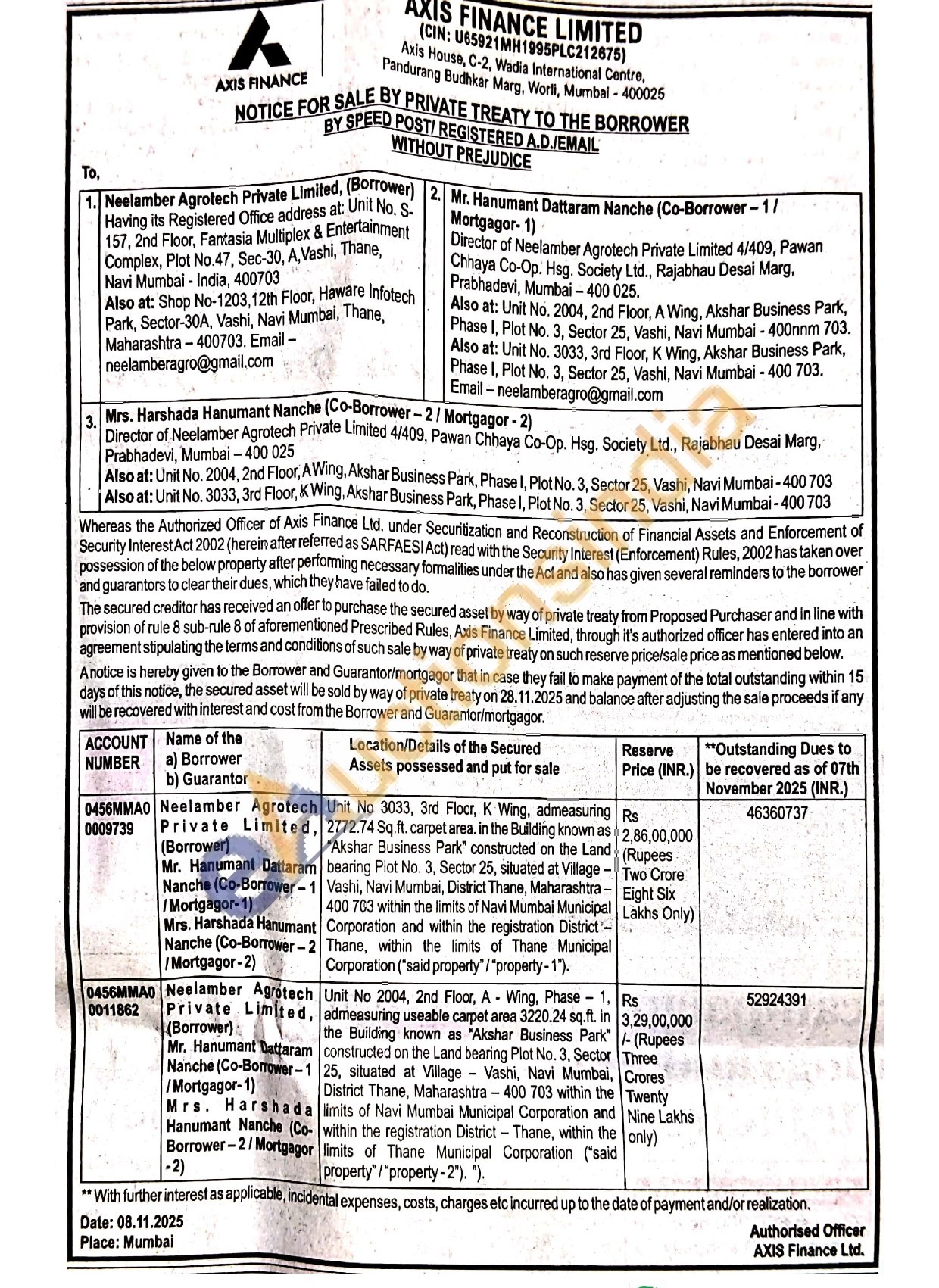 Unit No 3033, 3rd Floor, K Wing, admeasuring Rs 2772.74 Sq.ft. carpet area. in the Building known as "Akshar Business Park" constructed on the Land bearing Plot No. 3, Sector 25, situated at Village -Vashi, Navi Mumbai, District Thane, Maharashtra-400 703 within the limits of Navi Mumbai Municipal Corporation and within the registration District-Thane, within the limits of Thane Municipal Corporation ("said property"/"property-1