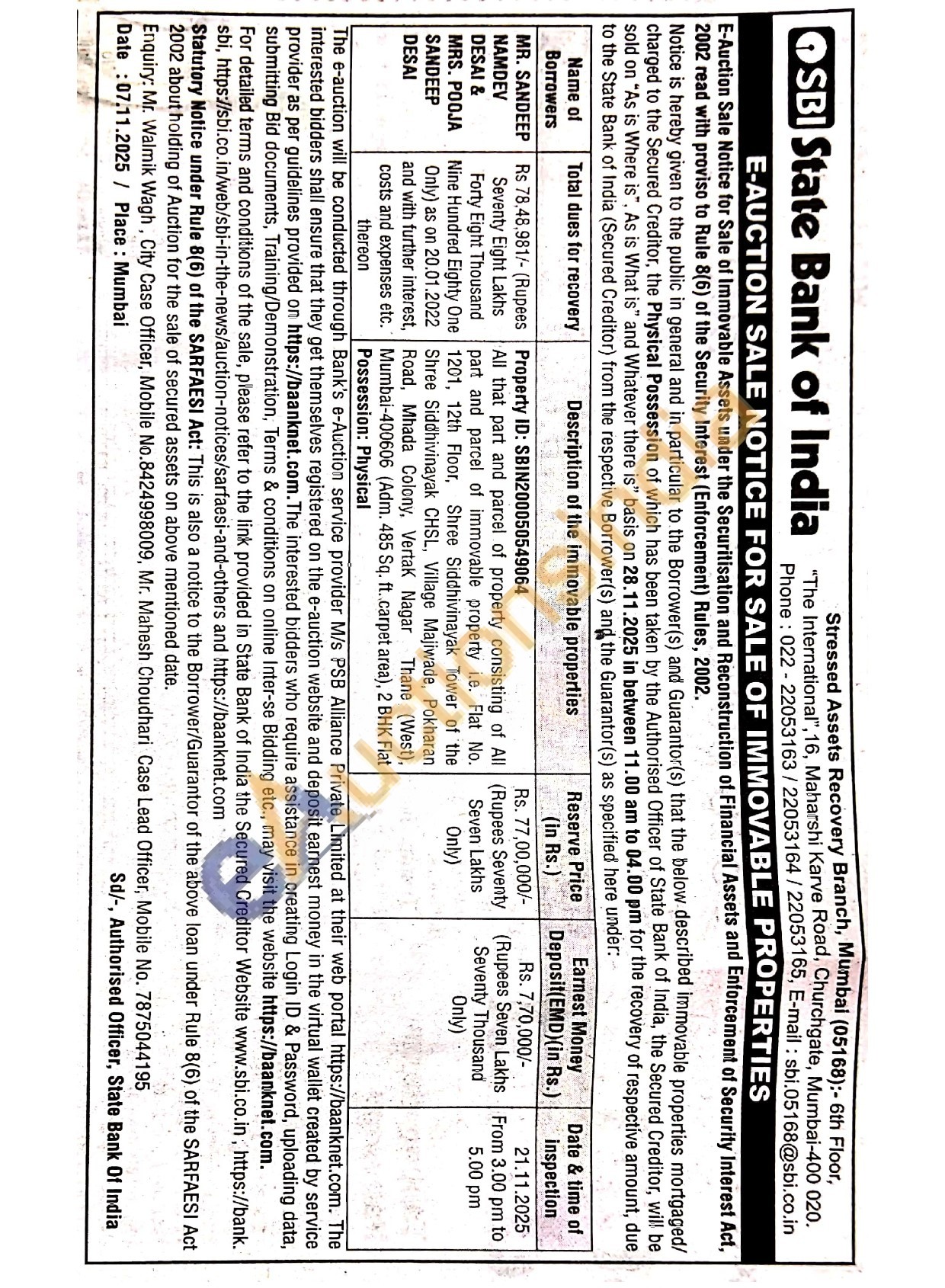All that part and parcel of property consisting of All part and parcel of immovable property i.e. Flat No. 1201, 12th Floor, Shree Siddhivinayak Tower of the Shree Siddhivinayak CHSL, Village Majiwade, Pokharan Road, Mhada Colony, Vertak Nagar Thane (West), Mumbai-400606 (Adm. 485 Sq. ft..carpet area), 2 BHK Flat