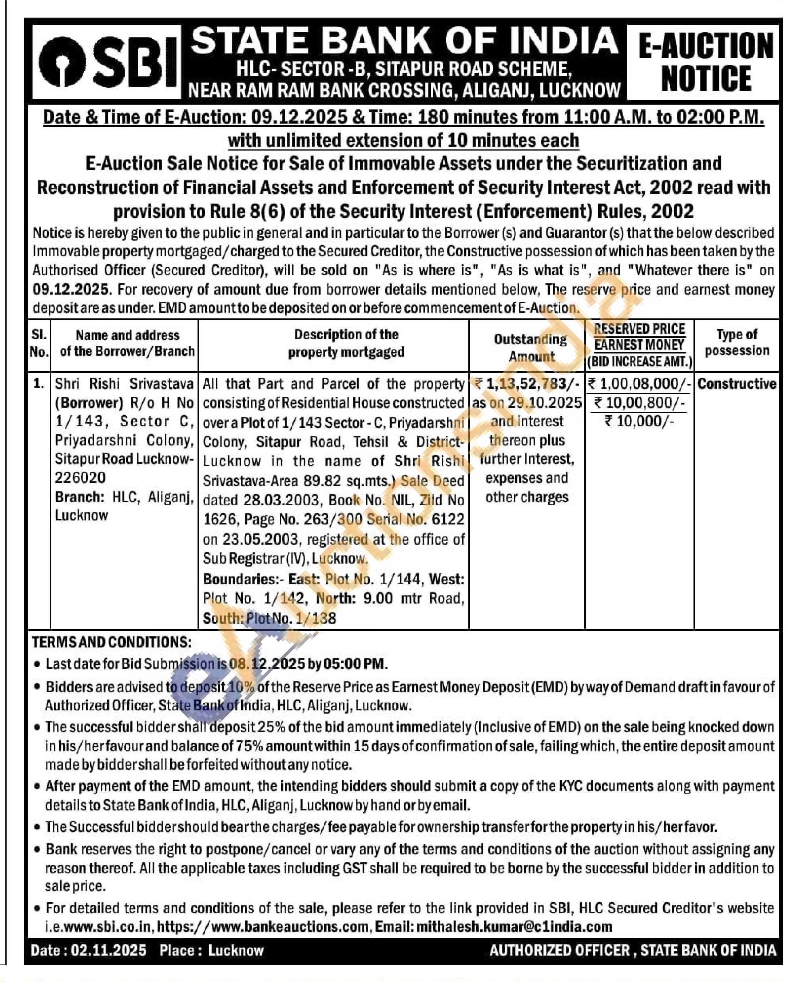 All that Part and Parcel of the property consisting of Residential House constructed over a Plot of 1/143 Sector-C, Priyadarshni Colony, Sitapur Road, Tehsil & District-Lucknow in the name of Shri Rishi Srivastava-Area 89.82 sq.mts.) Sale Deed dated 28.03.2003, Book No. NIL, Zild No 1626, Page No. 263/300 Serial No. 6122 on 23.05.2003, registered at the office of Sub Registrar (IV), Lucknow. Boundaries:- East: Plot No. 1/144, West: Plot No. 1/142, North: 9.00 mtr Road, South: Plot No. 1/138