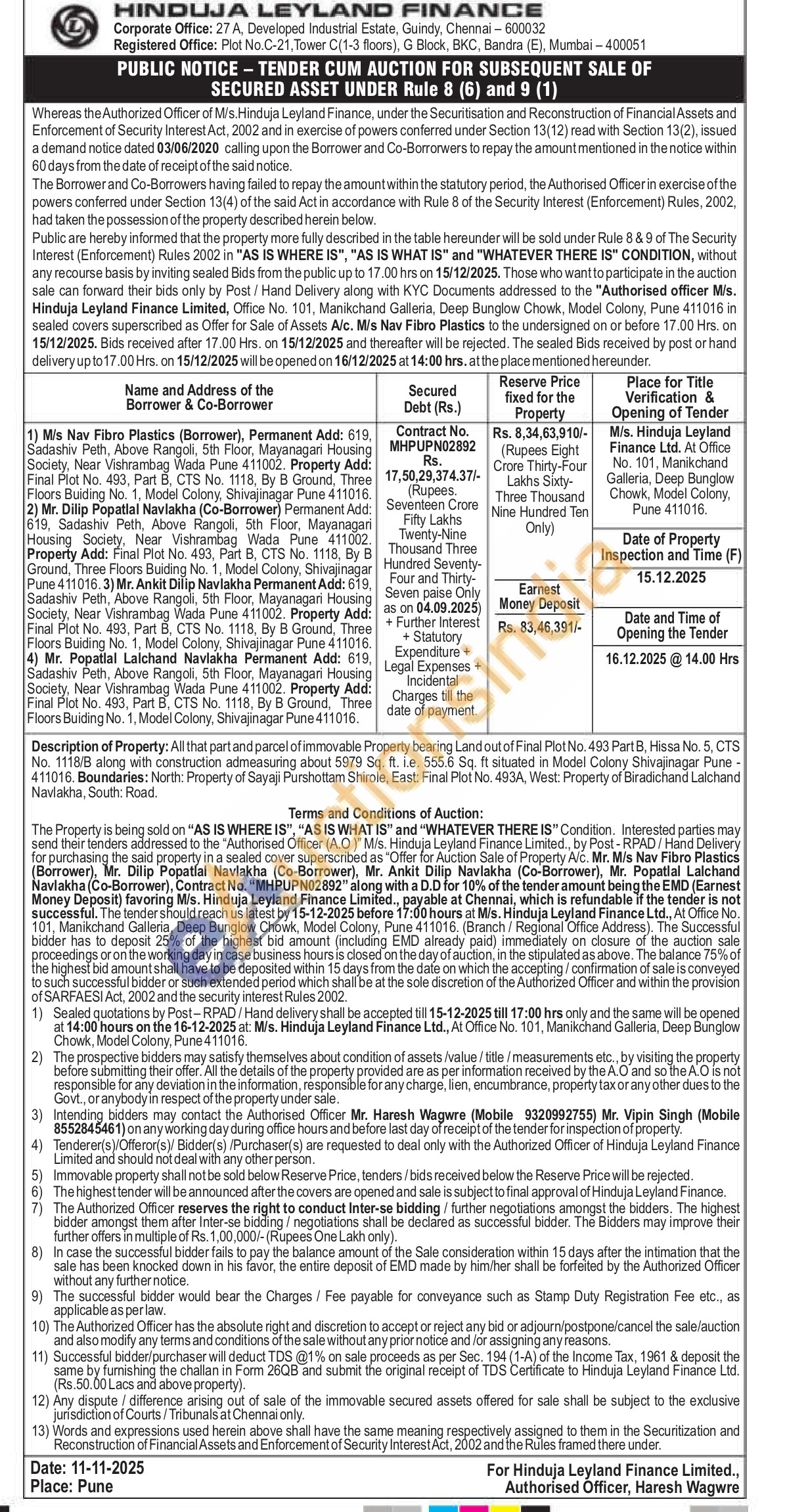 Description of Property: All that part and parcel of immovable Property bearing Land out of Final Plot No. 493 Part B, Hissa No. 5, CTS No. 1118/B along with construction admeasuring about 5979 Sq. ft. ie. 555.6 Sq. ft situated in Model Colony Shivajinagar Pune-411016. Boundaries: North: Property of Sayaji Purshottam Shircle, East: Final Plot No. 493A, West: Property of Biradichand Lalchand Navlakha, South: Road